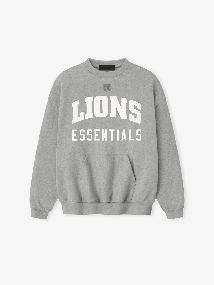 The Lions Sport Crewneck is crafted from heavy 480gsm core fleece and cut in a relaxed sport fit. The front features a bold "Lions Essentials" puff-print graphic, while the back displays the official Detroit Lions logo. Additional details include a kangaroo pocket and rib-knit collar, cuffs, and waist hem. The look is finished with the signature rubberized Fear of God Essentials label. DETAILS - 80% COTTON / 20%POLYESTER FLEECE 480GSM - ESSENTIALS SPORT FIT: RELAXED, - LIONS ESSENTIALS GRAPHIC - DETROIT LIONS LOGO - FEAR OF GOD LABEL - KANGAROO POCKET - RIB KNIT COLLAR, CUFF AND WAIST HEM - IMPORTED