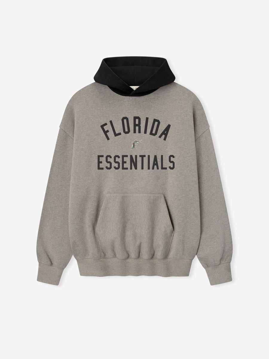 The Marlins Sport Hoodie is crafted from core fleece, offering an elevated balance of softness, structure, and lasting comfort. Cut in a relaxed sport fit, it drapes with more ease through the body and extended length compared to the Essentials classic silhouette. The front features a bold puffer-print graphic reading "Florida Essentials" alongside the official MLB insignia, while the back is finished with the authentic Marlins logo. Additional features include a contrasting hood, kangaroo pocket, rib-knit at the cuffs and waist hem. The signature rubberized Fear of God Essentials label accents the hood. DETAILS - 80% COTTON / 20%POLYESTER FLEECE - ESSENTIALS SPORT FIT: RELAXED, CROPPED - FLORIDA ESSENTIALS + MARLINS LOGO - MARLINS LOGO - KANGAROO POCKET - ELASTIC BINDING AT CUFF AND WAIST HEM - IMPORTED