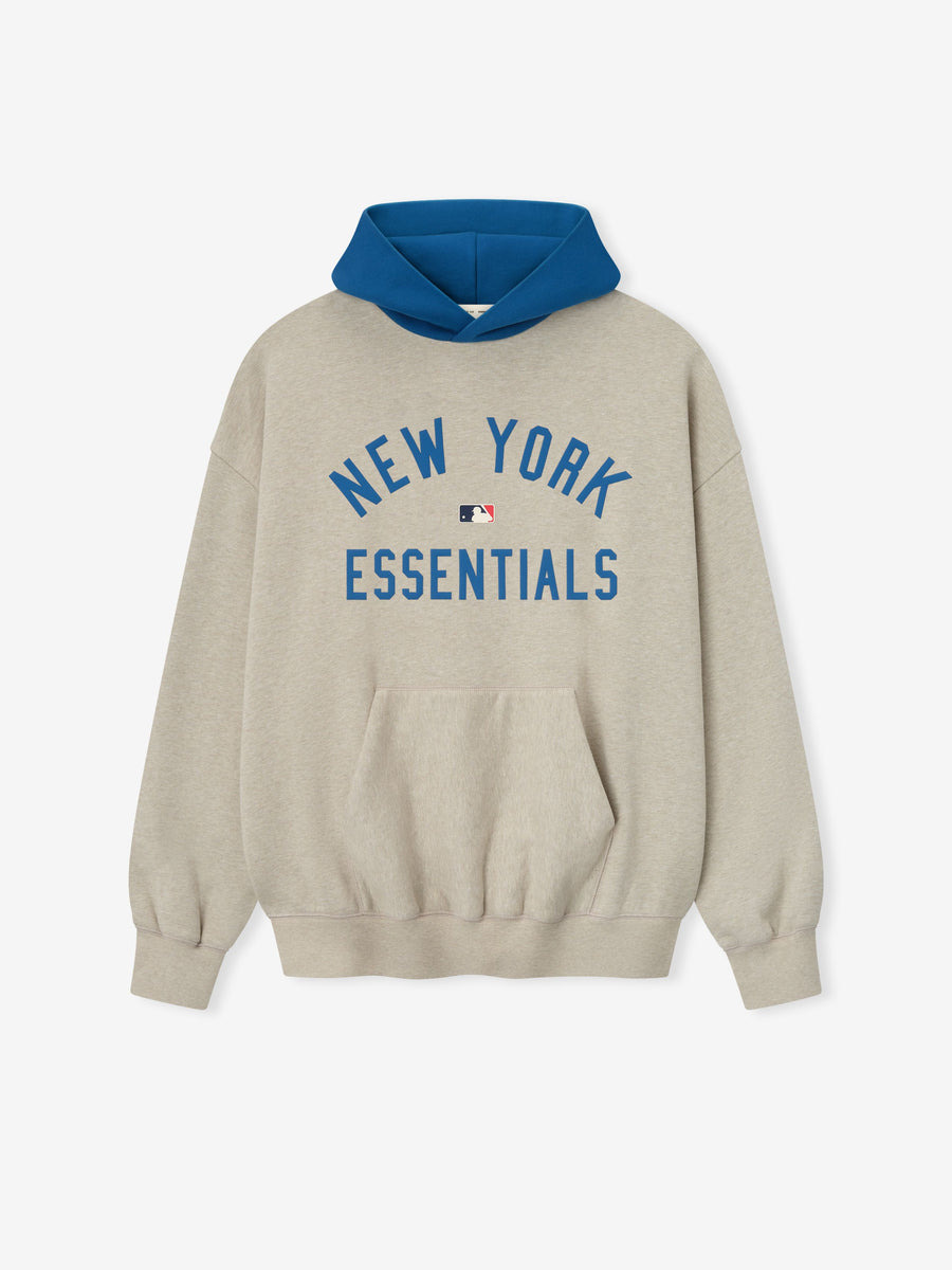 The Mets Sport Hoodie is crafted from core fleece, offering an elevated balance of softness, structure, and lasting comfort. Cut in a relaxed sport fit, it drapes with more ease through the body and extended length compared to the Essentials classic silhouette. The front features a bold puffer-print graphic reading "New York Essentials" alongside the official MLB insignia, while the back is finished with the authentic "NY" Mets logo. Additional features include a contrasting hood, kangaroo pocket, rib-knit at the cuffs and waist hem. The signature rubberized Fear of God Essentials label accents the hood. DETAILS - 80% COTTON / 20%POLYESTER FLEECE - ESSENTIALS SPORT FIT: RELAXED, CROPPED - NEW YORK ESSENTIALS +MLB LOGO - NY LOGO - KANGAROO POCKET - ELASTIC BINDING AT CUFF AND WAIST HEM - IMPORTED