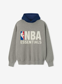 The NBA Sport Hoodie is crafted from core fleece, offering an elevated balance of softness, structure, and lasting comfort. Cut in a relaxed sport fit, it drapes with more ease through the body and extended length compared to the Essentials classic silhouette. The front features a bold puffer-print graphic "NBA ESSENTIALS" alongside the official NBA logo. Additional features include contrasting hood, side pockets, rib-knit at the cuffs and waist hem. The signature rubberized Fear of God Essentials label accents the hood. DETAILS - 80% COTTON / 20%POLYESTER FLEECE - ESSENTIALS SPORT FIT: RELAXED, CROPPED - NBA ESSENTIALS LOCKUP - NBA LOGO - FEAR OF GOD LABEL - SIDE POCKETS - CONTRASTING HOOD - ELASTIC BINDING AT CUFF AND WAIST HEM - IMPORTED