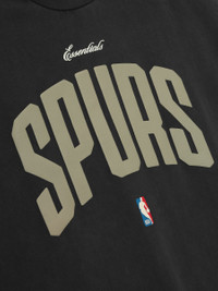 The Spurs 90s Tee is cut from 100% cotton heavy jersey, offering a soft yet substantial hand feel. Designed in an oversized 90s-inspired silhouette, it features exaggerated proportions with dropped shoulders for a relaxed drape. The front is defined by a puff-print application of the "ESSENTIALS SPURS" lockup alongside the NBA insignia.. The signature rubberized Fear of God Essentials label at the collar. Fit Note: Size Medium fits like Classic Tee XL. DETAILS - 100% COTTON HEAVY JERSEY - ESSENTIALS 90s FIT - OVERSIZED BODY AND SLEEVES - ESSENTIALS SPURS GRAPHIC - NBA LOGO - CLASSIC RIB-KNIT COLLAR - FEAR OF GOD ESSENTIALS RUBBERIZED LABEL AT BACK COLLAR - IMPORTED