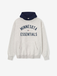 The Twins Sports Hoodie is crafted from core fleece, offering an elevated balance of softness, structure, and lasting comfort. Cut in a relaxed sport fit, it drapes with more ease through the body and extended length compared to the Essentials classic silhouette. The front features a bold puffer-print graphic reading "Minnesota Essentials" alongside the official MLB insignia, while the back is finished with the authentic Twins logo. Additional features include a contrasting hood, kangaroo pocket, elastic bindings at the cuffs and waist hem. The signature rubberized Fear of God Essentials label accents the hood. DETAILS - 80% COTTON / 20%POLYESTER FLEECE - ESSENTIALS SPORT FIT: RELAXED, CROPPED - MINNESOTA ESSENTIALS +MLB LOGO - SOX LOGO - KANGAROO POCKET - ELASTIC BINDING AT CUFF AND WAIST HEM - IMPORTED