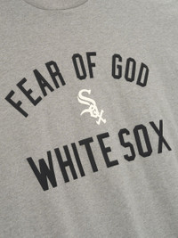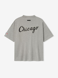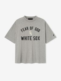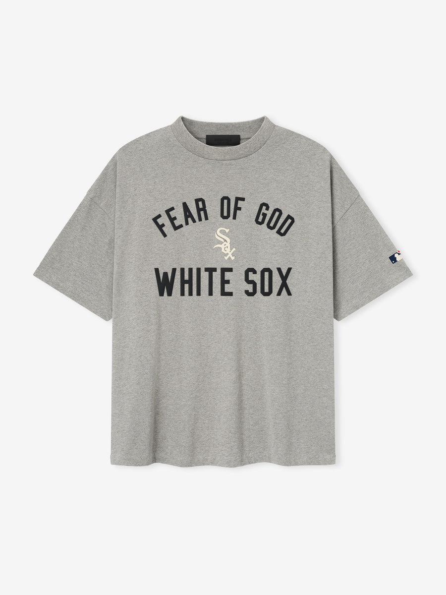 The White Sox 90s Tee is cut from 100% cotton jersey, offering a soft yet substantial hand feel. Designed in an oversized 90s-inspired silhouette, it features exaggerated proportions with dropped shoulders for a relaxed drape. The front is defined by a bold puffer-print application of the "Fear of God White Sox" lockup, alongside the MLB insignia on the sleeve. Across the back, an official Chicago logo anchors the piece with the signature rubberized Fear of God Essentials label at the collar. Size Note: size down for a classic fit DETAILS - 100% COTTON JERSEY, 220GSM - ESSENTIALS 90s FIT - OVERSIZED BODY AND SLEEVES - FEAR OF GOD WHITE SOX GRAPHIC - MLB LOGO - CHICAGO LOGO - CLASSIC RIB-KNIT COLLAR - FEAR OF GOD ESSENTIALS RUBBERIZED LABEL AT BACK COLLAR - IMPORTED