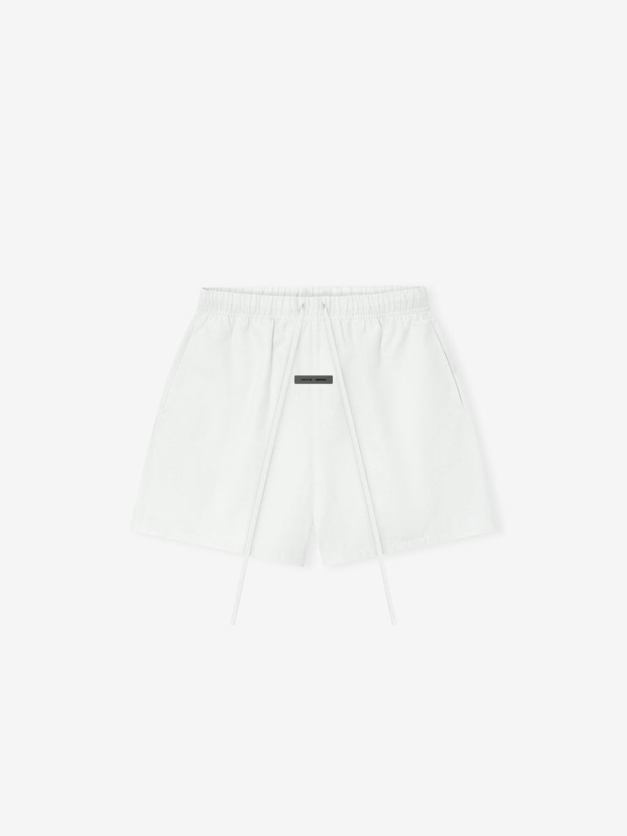 The Womens Classic Short is crafted from 100% cotton Oxford cloth for lightweight comfort. The short is designed to have a mid-length and a rounded, feminine contour. Key features include side pockets and an encased elastic waistband with drawstrings. Additionally, a Fear of God Essentials rubberized label is positioned at the center front. DETAILS - 100% cotton Oxford cloth - MODEL IS 5'10" AND WEARS SIZE SMALL IN CLOUD WHITE - Womens Soccer fit - relaxed, mid length - Encased elastic waistband - Heavyweight drawstring with rubberized tip - Side seam pockets - "Fear of God Essentials" translucent rubberized label - Imported