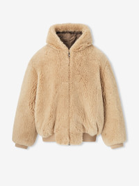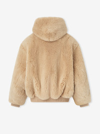 The Hooded Bomber is made in the Italy from alpaca for plush texture and cozy comfort. The signature Fear of God fit is evident in the relaxed silhouette with dropped. Additional details include a front antique brass zipper, side pockets, double-layered hood, wool rib-knit cuffs, and waist hem. A leather Fear of God label is stitched on the hood. DETAILS - 100% Shearling - Relaxed Fit: relaxed body, drop shouders - Double-layer hood - Full zip front - Rib-knit cuffs, waist hem - Side pockets - Fear of God label - Made in Italy