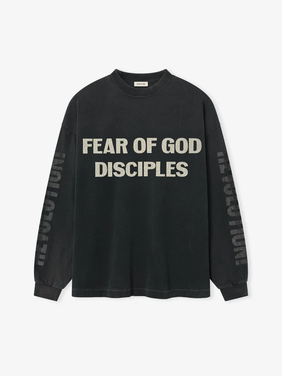 The Disciple Long Sleeve Tee is crafted in the USA from 100% heavyweight cotton jersey and features a garment wash with a sunfade treatment for an authentic vintage appearance. The hand-printed graphics are inspired by the civil rights movement. This rib-knit crewneck tee has a relaxed fit with drop shoulders and includes a stitched Fear of God label at the back collar. DETAILS - 100% cotton jersey, 290 gsm - Relaxed fit: loose in body, drop shoulders - Garment wash with a sunfade - Hand printed graphics - Rib-knit crewneck, cuffs - Fear of God label - Made in USA