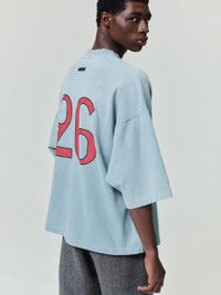 The Fear of God 26 Tee is crafted in the USA from 100% heavyweight cotton jersey and features a garment wash with a sun fade treatment for an authentic vintage appearance. Hand-printed graphics reference heritage athletic lockups from the past. Designed in a relaxed fit, the tee features a rib-knit crewneck. The piece is finished with the iconic Fear of God four-stitch label at the back collar.