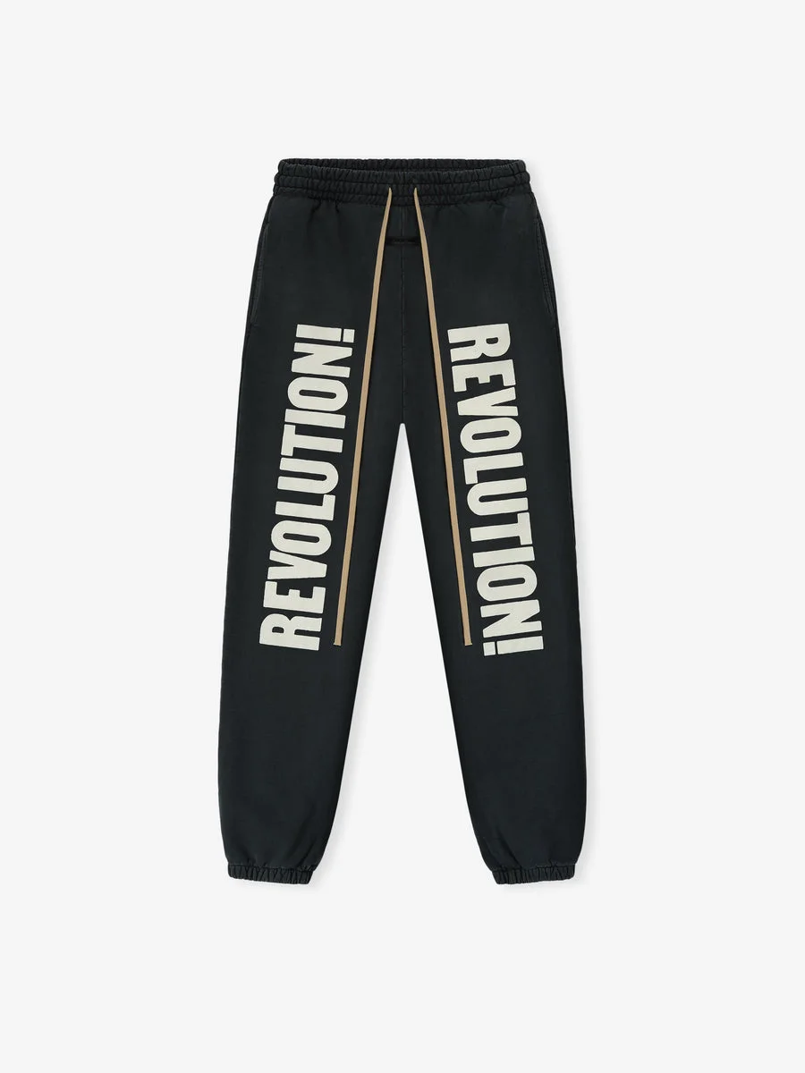 Limited Edition FearofGod.com Exclusive: The Revolution sweatpant is made in the USA from 100% cotton fleece and features a relaxed fit. It showcases hand-printed graphics inspired by the Civil Rights movement. A garment wash, sunfade, and hand-vintaging treatments give it an authentic, time-worn appearance. Additional details include elasticated waist hem drawstrings, elasticated bottom hem and along with a Fear of God label. DETAILS - 100% cotton fleece - Relaxed Fit: - Garment wash with a sunfade - Hand printed graphics - Elastic waist hem with drawstring - Elastic bottom hem - Fear of God label - Made in USA
