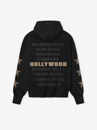The Vogue Fear of God Neighborhood Hoodie is crafted in the USA from 100% heavyweight cotton fleece and features a sunfade wash with hand-distressing for an authentic vintage appearance. Hand-printed graphics feature the Vogue Fear of God lockup across the chest, while the neighborhoods of Los Angeles are celebrated on the back—a nod to the city’s cultural landscape. The sleeves are detailed with stars from the iconic Hollywood Walk of Fame. The piece is framed by rib knit cuffs, waist hem, side pockets and Fear of God label on the hood. Fit Note: size up for a relaxed fit. DETAILS - Limited Edition Vogue Fear of God - 100% cotton fleece - Vintage fit: shrunken, cropped - Garment wash with a sunfade - Hand printed graphics - Double-layer hood - Rib-knit cuffs, waist hem - Side Pockets - Fear of God label - Made in USA