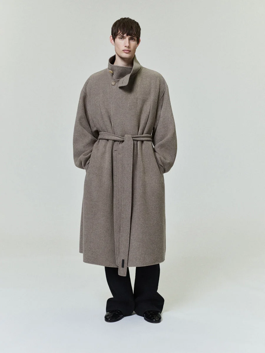 The Highneck Coat is crafted in Italy from luxurious double-faced wool-cashmere, which offers a luxuriously soft touch and an unstructured design that enhances the fabric's drape. Its double-breasted style features a voluminous body for comfortable layering. Additional details include horn button closures, a chest pocket, side pockets, and a self-fabric belt. DETAILS - Fabric: 90% wool, 10% cashmere - Models are wearing size Medium - Relaxed fit - Double breasted - Highneck - Horn button - Side pockets - Fear of God label - Made in Italy