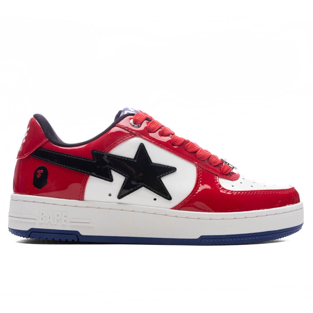 The Bape STA #1 M2 in Red brings a fresh take to a timeless silhouette. Featuring a leather upper with patent leather overlays, the design blends texture and shine seamlessly. The iconic STA logo adorns the side panels, while a perforated toe box ensures added breathability. A branded dubrae and embroidered heel complete the look, delivering signature Bape style in every detail. - Leather upper - Patent leather overlays - STA on side panels - Perforated toe box - Branded dubrae - Embroidered heal - Style No: 001FWK801301M-RED