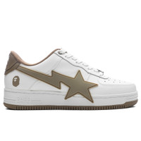 The Bape Sta OS #2 M2 in White and Beige. This iconic sneaker features a perforated toe box for a stylish and breathable design. The lace-up closure is accented with logo hardware, while the padded tongue boasts a prominent logo patch. The padded collar and padded mesh footbed ensure a comfortable fit. The signature logo applique sits on the sides, and a logo is embossed on the heel tab. - Logo hardware at lace-up closure - Logo patch at padded tongue - Padded collar - Logo applique at sides - Logo embossed at heel tab - Padded mesh footbed - Buffed leather lining - Style No: 001FWK201314MBEI
