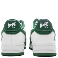 The Bape Sta OS #2 M2 in White and green. This iconic sneaker features a perforated toe box for a stylish and breathable design. The lace-up closure is accented with logo hardware, while the padded tongue boasts a prominent logo patch. Comfort is ensured with a padded collar and a padded mesh footbed. The signature logo applique sits on the sides, and a logo is embossed on the heel tab. - Logo hardware at lace-up closure - Logo patch at padded tongue - Padded collar - Logo applique at sides - Logo embossed at heel tab - Padded mesh footbed - Buffed leather lining - Style No: 001FWK201314MGRN