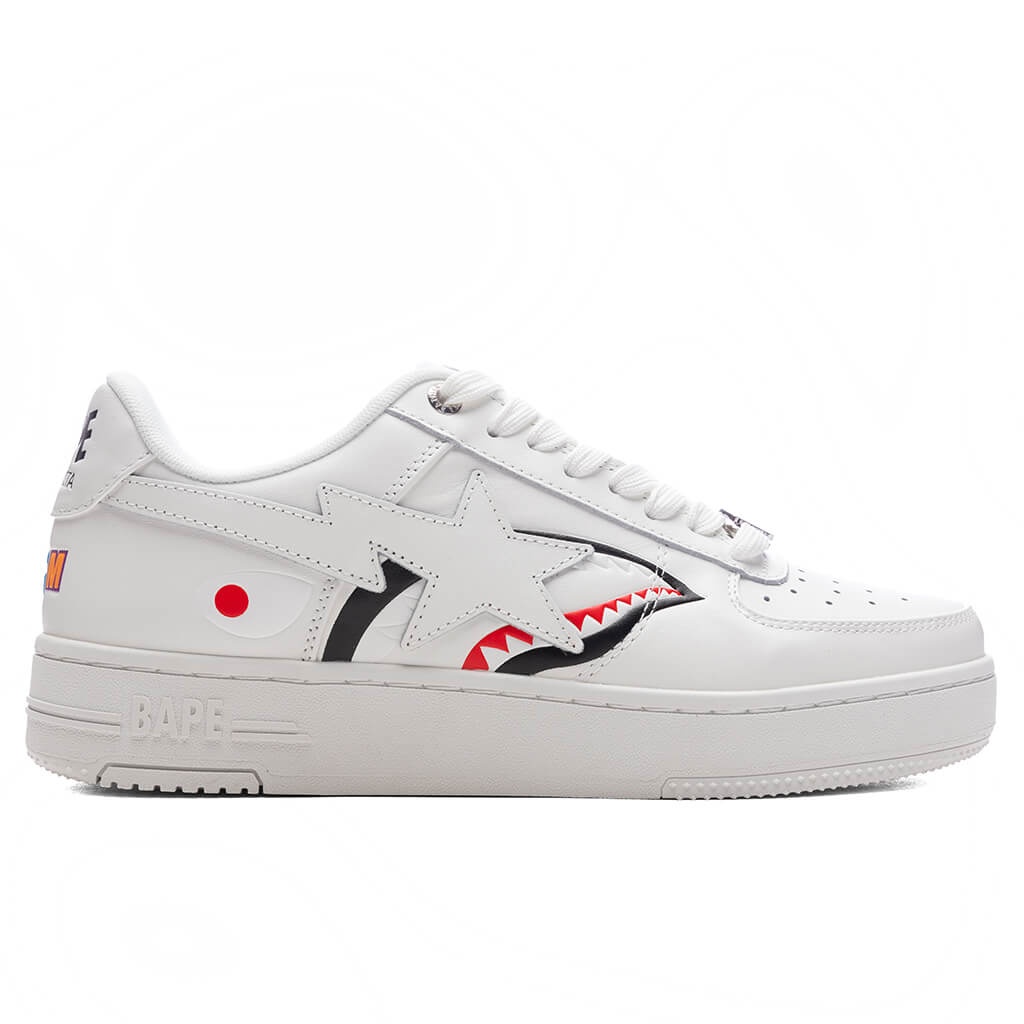 The Bape STA Shark M2 in White merges bold graphics with a classic silhouette. Crafted with a leather upper, this design features the signature BAPE shark print on the side panel alongside the iconic STA logo. Perforated details on the toe box enhance breathability, while a durable rubber midsole and outsole provide comfort and stability. Finished with embroidered branding on the heel and a branded dubrae, this sneaker brings unmistakable Bape energy to any collection. - Leather upper - Branded dubrae - Embroidered branding on heel - STA on side panel - BAPE shark print on side panel - Rubber midsole and outsole - Perforated toe box - Style No: 001FWK801307M-WHT