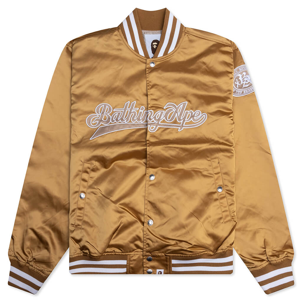 The Baseball Varsity Jacket from A Bathing Ape delivers timeless style. Crafted from nylon with a polyester lining, it provides durability and sophistication. A script wordmark patch on the front and a graphic patch on the sleeve add standout detailing, while the full snap closure, front pockets, and striped ribbed trims add to the varsity look. - 100% Nylon - Polyester lining - Full snap closure - Striped ribbed trims - Interior chest pocket - Snap-closure side pockets - Wordmark patch - Graphic patch - Woven brand tag at hem - Style No: 001LJL301011M-BEI