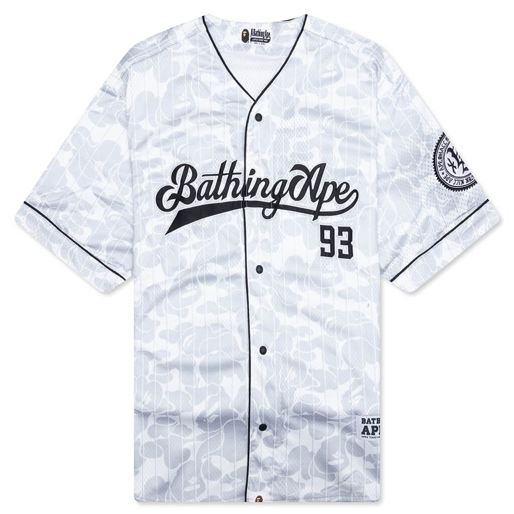 Inspired by baseball aesthetics, the Camo Stripe Baseball Shirt features a full polyester mesh construction. Covered in the signature BAPE camo print and stripes, the shirt is decorated with embroidered wordmark, number, and graphic patches. The full snap-closure and black piping on the collar, placket, and sleeves stays true to the baseball feel. Finished with woven label tags at the front for distinguishable branding. - 100% Polyester - Mesh fabric - Allover camo and stripe pattern - Snap-closure - Piping on collar/placket/sleeves - Embroidered patches - Woven brand labels - Style No: 001SRL301003M-GRA