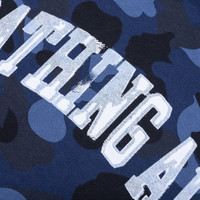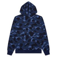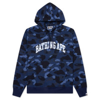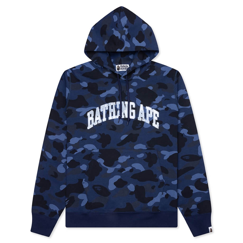 The Color Camo Pullover Hoodie in Navy showcases a bold all-over BAPE camo design, delivering signature style. Made from cotton, this hoodie features a screen-printed script on the front for added flair. A kangaroo pocket and an attached hood with adjustable drawstrings provide practical functionality, while ribbed cuffs and hem ensure a snug fit. - 100% Cotton - All over BAPE camo - Screen printed script on front - Kangaroo pocket - Attached hood w/ drawstrings - Ribbed cuffs and hem - Relaxed fit - Style No: 001PPK801011M-NVY