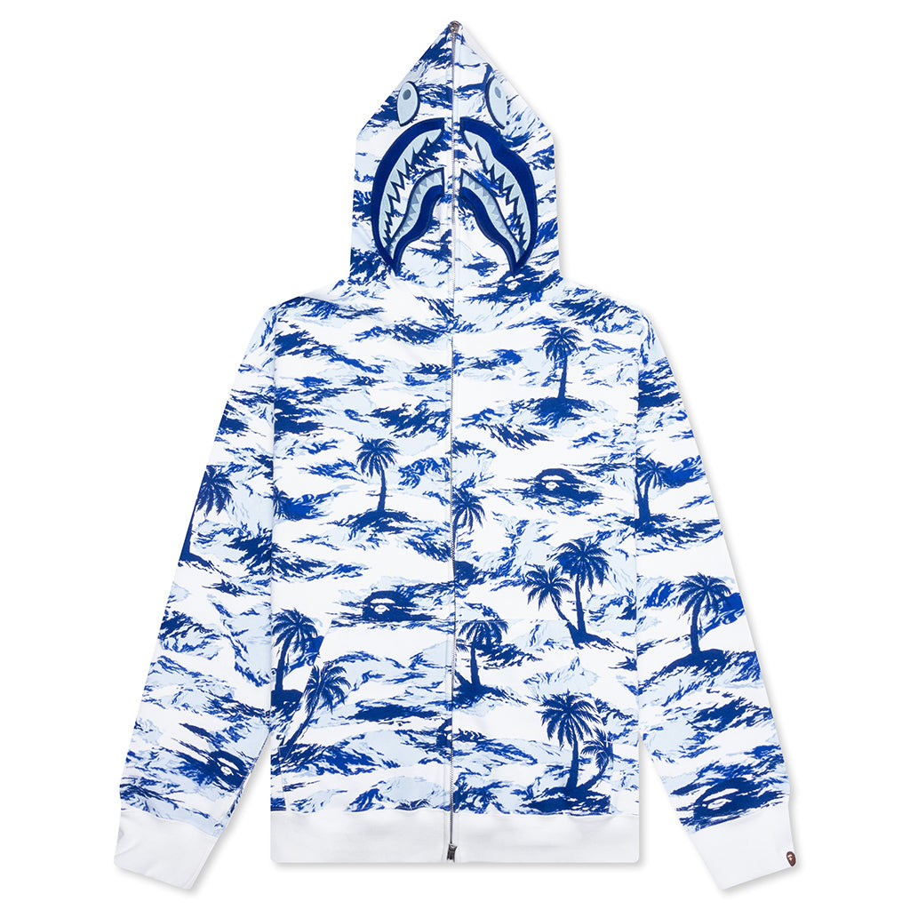 A Bathing Ape presents the Palm Tree Camo Relaxed Fit Shark Full Zip Hoodie—the newest addition to its iconic Shark hoodie collection. Adorned in an allover palm tree camo print, the hoodie features a full-zip closure that extends up to the hood. Decorated with chenille patches, the hood showcases the signature Shark face logo and BAPE branding. Finished with ribbed trims and a kangaroo pocket. - 100% Cotton - Full zip closure up to hood - Two-way zipper - Ribbed trims - Kangaroo pocket - Chenille patches - BAPE branding - Style No: 001ZPL301313M-BLU