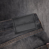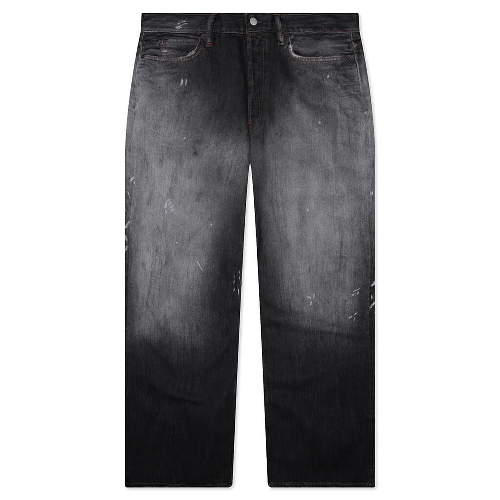 The Acne Studios 1981 U Black Trafalgar jeans are a bold take on classic denim, featuring a loose, baggy fit with a mid-rise waist and full-length leg. Crafted from rigid organic cotton, they're finished in a deep black slubby wash with intentional stains and paint marks for a worn-in look. Traditional five-pocket styling, a button fly, and a branded label patch at the back complete the design—making these jeans a statement piece with an edge. - 100% Cotton - Patch: 100% Cow Leather - Loose fit - Mid-rise waist - Wide baggy leg - Long length - Faded wash - 5-pocket construction - Button fly - Back leather patch - Intentional stain & paint marks - Style No: C00081-900