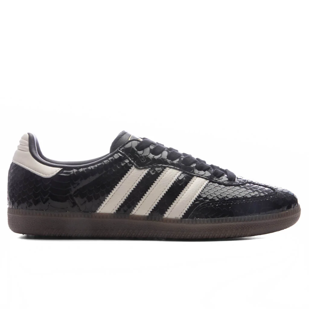 The Women's Samba OG in Core Black/Off-White/Gum Green brings timeless design and premium craftsmanship with a new look. Featuring a patent leather upper with a snakeskin texture to give it standout style. Adidas branding is shown with the signature 3-Stripes and trefoil on the tongue. A lace closure ensures a secure fit, while the synthetic sockliner adds comfort. Finished with a gum rubber outsole for traction and style, the Samba OG remains an icon in any rotation. - Patent leather upper - Snakeskin texture - Lace closure - Synthetic sockliner - Trefoil logo - Adidas branding - Signature T-toe - Gum rubber outsole - All sizes are listed in U.S. Women's sizing unless stated otherwise - Style No: IH9015