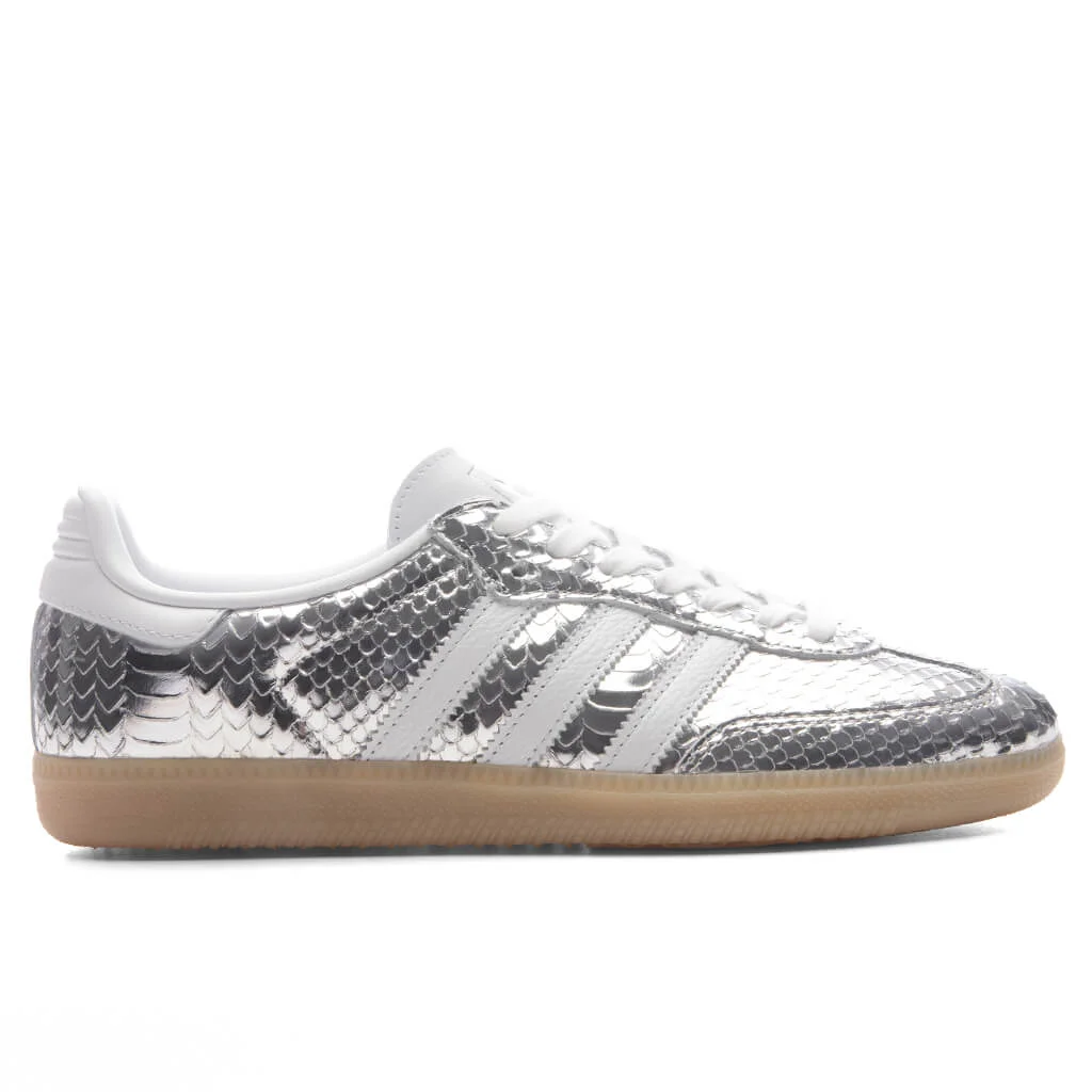 The Women's Samba OG in Core Black/Off-White/Gum Green brings timeless design and premium craftsmanship with a new look. Featuring a patent leather upper with a snakeskin texture to give it standout style. Adidas branding is shown with the signature 3-Stripes and trefoil on the tongue. A lace closure ensures a secure fit, while the synthetic sockliner adds comfort. Finished with a gum rubber outsole for traction and style, the Samba OG remains an icon in any rotation. - Patent leather upper - Snakeskin texture - Lace closure - Synthetic sockliner - Trefoil logo - Adidas branding - Signature T-toe - Gum rubber outsole - All sizes are listed in U.S. Women's sizing unless stated otherwise - Style No: IH9016