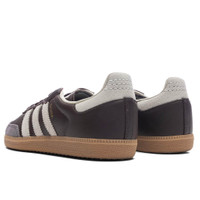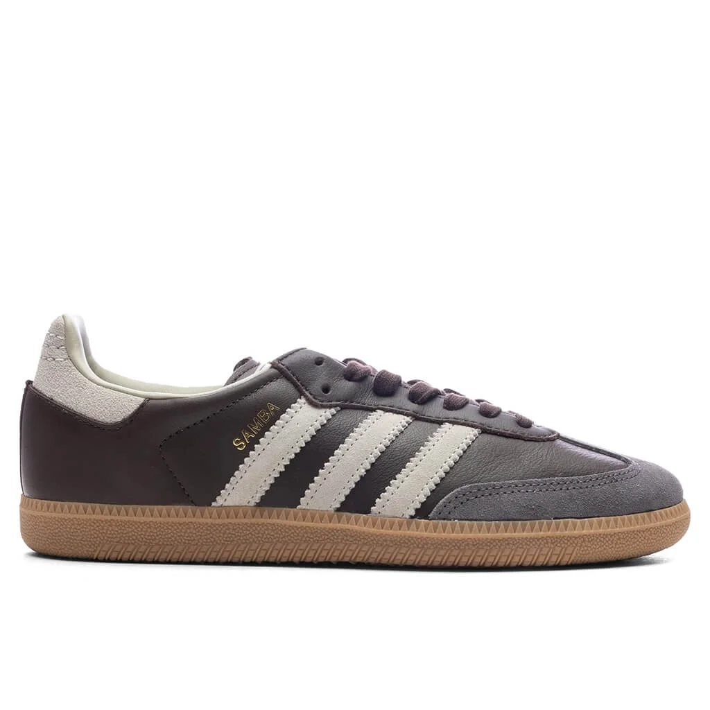 The Samba OG in Brown/Putty Grey/Gold Metallic continues its legacy with a refined design and classic elements. Crafted with a full-grain leather upper, this iteration is accented by suede overlays and gold foil details for a polished touch. A lace closure ensures a secure fit, while the synthetic leather lining adds comfort. The gum rubber midsole and outsole provide reliable traction and a timeless look. - Full grain leather upper - Suede/gold foil details - Lace closure - Synthetic leather lining - Gum rubber midsole - Gum rubber outsole - All sizes are listed in U.S. Men’s sizing unless stated otherwise - Style No: ID1481