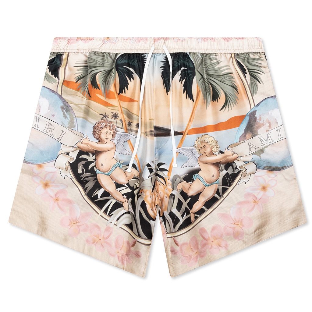 The Amiri Cherub Silk Shorts in Multi are a luxurious addition to your wardrobe, crafted from 100% silk twill for a smooth and elegant feel. Made in Italy with meticulous attention to detail, these shorts feature side seam pockets and an elastic waist with a drawcord for a comfortable fit. Adorned with cherub, palm tree motifs, and pink orchid graphics, these shorts showcase a blend of style and sophistication. - 100% Silk - Made in Italy - Side seam pockets - Elastic waist with drawcord - Cherub, palm tree motifs, and pink orchid graphics - Style no: AMSHCA1015-900