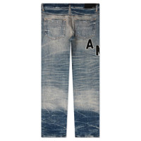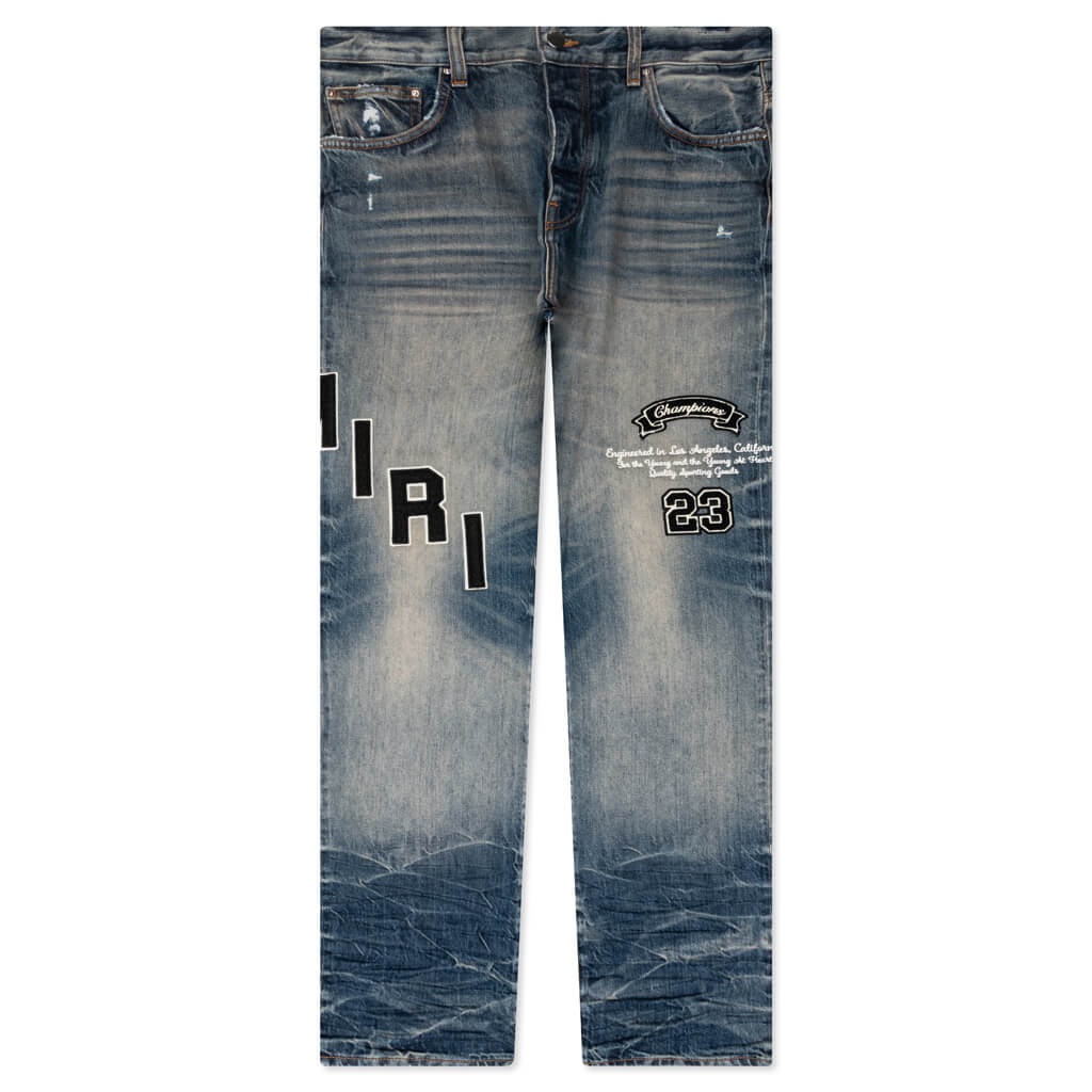 Taking on a contemporary aesthetic, the Amiri Hockey Logo Straight Jean makes an impression with their 12 oz Italian stretch denim cotton construction. The design features a signature side vent with a button closure on the hem. - Cotton/elastane blend - Made in Italy - Zip/button fly - Side vent - Hem button closure - Style No: AW23MDF004-875