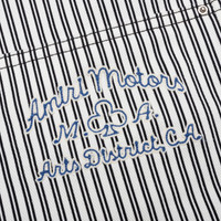 Inspired by the house's Arts District roots, the Motors Carpenter Pant is made with a five pocket silhouette and a black and white vertical stripes pattern allover the pant. Featuring a classic carpenter structure and an embroidered Amiri script logo on the right leg. - Belt loops - Button and zip fly closure - Branded buttons - True to size - Style No: PS24MAW029-004