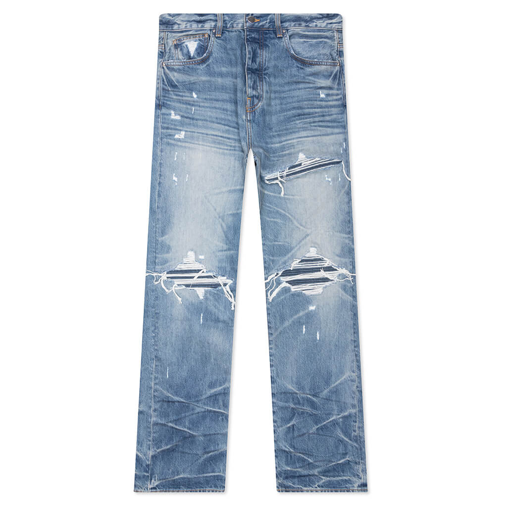 The Pleated Denim Straight MX1 Jean is made from premium cotton denim with a straight leg silhouette. Classic features include a button fly, five-pocket design, and belt loops. Holes at the knees and thigh are repaired with pleated denim underlays for subtle contrast and visual depth. Unique hand-distressed details, whiskering, and a faded wash treatment gives each pair a vintage vibe. - 100% Cotton - Straight leg - Hand-distressed - 5-pocket design - Button fly - Repaired with pleated denim - Faded wash treatment - Style No: AMDNGH1087-515