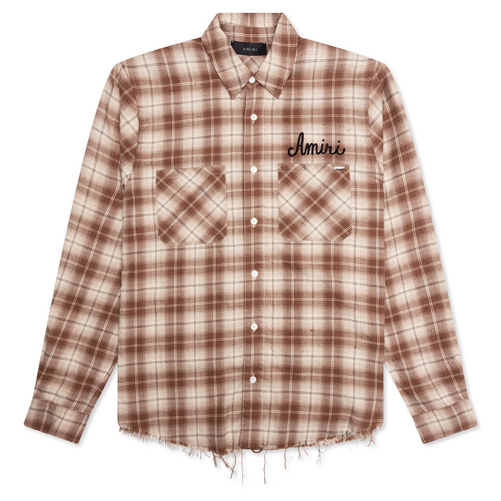 Amiri's Shotgun Flannel in Chocolate brings a rugged edge to a timeless staple. Made from cotton, this flannel features a classic collar and button-up closure for a versatile fit. The distressed raw hem and embroidered branding on the chest and back add signature Amiri details, while dual front chest pockets complete the look with a functional touch. - 100% Cotton - Classic collar - Button up closure - Distressed raw hem - Front chest pockets - Embroidered branding at chest & back - Style No: AMSTFL1009-234