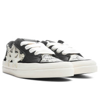 The Snake Sunset Skate Low in Black features a striking combination of matte and snake-embossed leather, highlighted by a layered star detail on the side. The design includes a flat heel, round toe, and lace-up vamp for a classic skate silhouette. Logos on the tongue and heel, along with a padded collar, add both style and comfort, while the durable rubber outsole ensures lasting wear. - Matte and snake-embossed leather construction - Layered leather star detail on the side - Flat heel and round toe design - Lace-up vamp for a secure fit - Logo on the tongue and heel - Padded collar for added comfort - Durable rubber outsole - Style No: AMFOSR1068-001