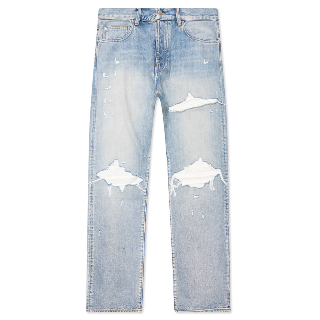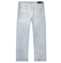 The Suede Straight MX1 Jean is made from premium cotton denim with a straight leg silhouette. Classic features include a button fly, five-pocket design, and belt loops. Holes at the knees and thigh are repaired with pleated suede underlays for subtle contrast and visual depth. Unique hand-distressed details, whiskering, and a faded wash treatment gives each pair a vintage vibe. - 100% Cotton - Straight leg - Hand-distressed - 5-pocket design - Button fly - Repaired with pleated suede - Faded wash treatment - Style No: AMDNGH1085-406