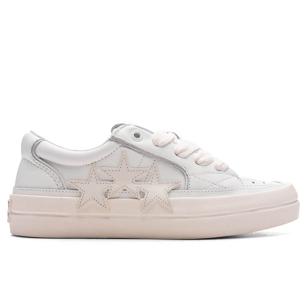 The Amiri Sunset Skate Low in White brings a sleek, minimalist edge to skate-inspired footwear. Crafted from matte leather, this design features a layered leather star detail on the side for subtle dimension. A flat heel, round toe, and padded collar combine for comfort and everyday wearability. The lace-up vamp ensures a secure fit, while logos on the tongue and heel deliver signature branding. - Matte leather construction - Layered leather star detail on the side - Flat heel and round toe design - Lace-up vamp for a secure fit - Logo on the tongue and heel - Padded collar for added comfort - Durable rubber outsole - All sizes are listed in U.S. Men’s sizing unless stated otherwise - Style No: AMFOSR1092-100
