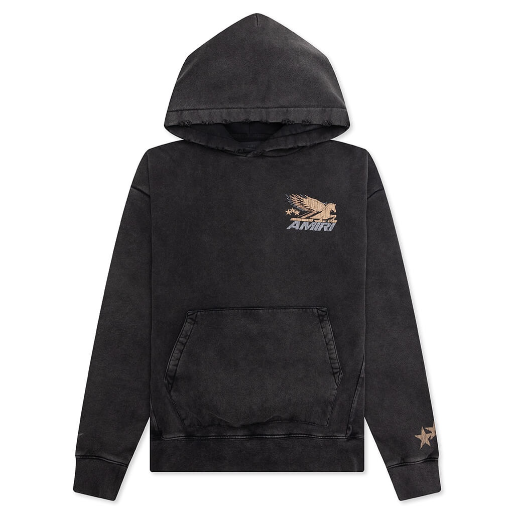 The Amiri Vintage Pegasus Hoodie in Black delivers a bold, lived-in aesthetic. Made from cotton, this hoodie features a vintage wash and a cracked printed graphic on the chest and back for a weathered, statement look. A kangaroo pocket, ribbed cuffs, and hem provide added comfort and functionality, while the attached fixed hood completes the piece with classic appeal. - 100% Cotton - Kangaroo pocket - Ribbed cuffs and hem - Cracked printed graphic at chest & back - Attached fixed hood - Vintage wash - Style No: AMJYHD1088-001