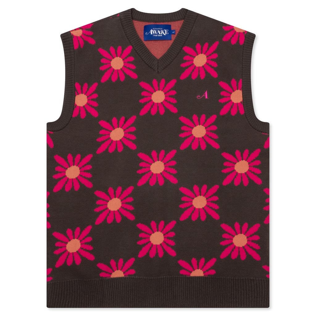 Made for any collection, the Checkered Floral Sweater Vest from Awake NY makes an impression with its elevated aesthetic. The jacquard knit sweater vest features a checkered floral pattern and embroidered ‘A’ logo for a finishing touch. - 100% cotton - V neckline - Checkered floral pattern - Embroidered logo - Ribbed detailing - Style No: AWK-SP23-KN008-BRO