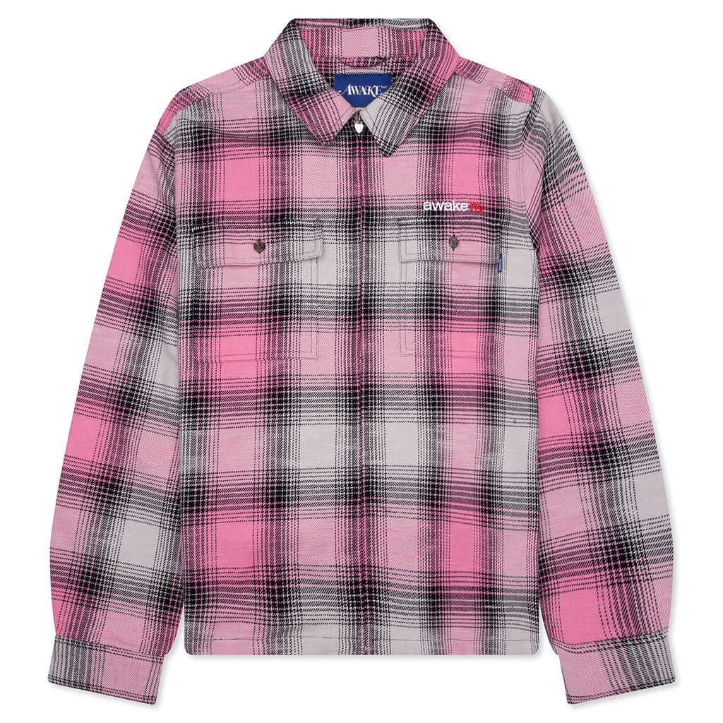 Awake NY presents the Flannel Zip Shirt. Constructed from cotton, the shirt is adorned in an all-over plaid print and designed to have a boxy fit. Featuring a full-zip closure, classic collar, chest pockets with button closures, and adjustable cuffs. Embroidered Awake NY branding completes the ensemble. - 100% Cotton - Boxy fit - Full-zip closure - Classic collar - Chest pockets with button closures - Buttoned cuffs - Embroidered branding - Style No: AWK-FW25-TP001-PINK