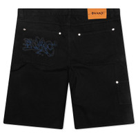 The Frayed Script Painter Shorts from Awake NY are composed of cotton denim and features the five-pocket construction with additional painter pockets at the thigh. This style has a classic zip-fly closure and belt loops. An embroidered Awake NY logo with intentional fraying on the back pocket completes the look. - 100% Cotton - Five-pocket design - Zip-fly closure - Hammer loop - Leather patch - Style No: AWK-SP25-PA004-BLK