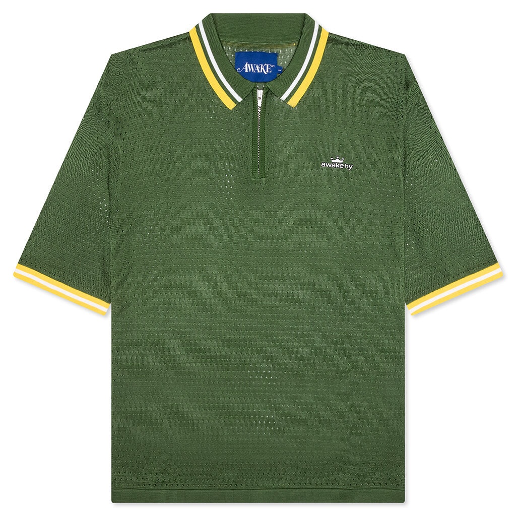 Awake NY's Mesh Polo is crafted from 100% rayon with a soft, breathable mesh construction that delivers both comfort and edge. A ribbed polo collar with a sleek zipper placket offers a refined look, complemented by ribbed cuffs and hem for a clean, athletic finish. Complete with an embroidered logo on the chest for subtle branding. - 100% Rayon - Soft, breathable mesh - Stretchy fabric construction - Ribbed polo collar with zipper placket - Ribbed cuffs and hem - Embroidered logo - Style No: AWK-SU25-KN001-GRN