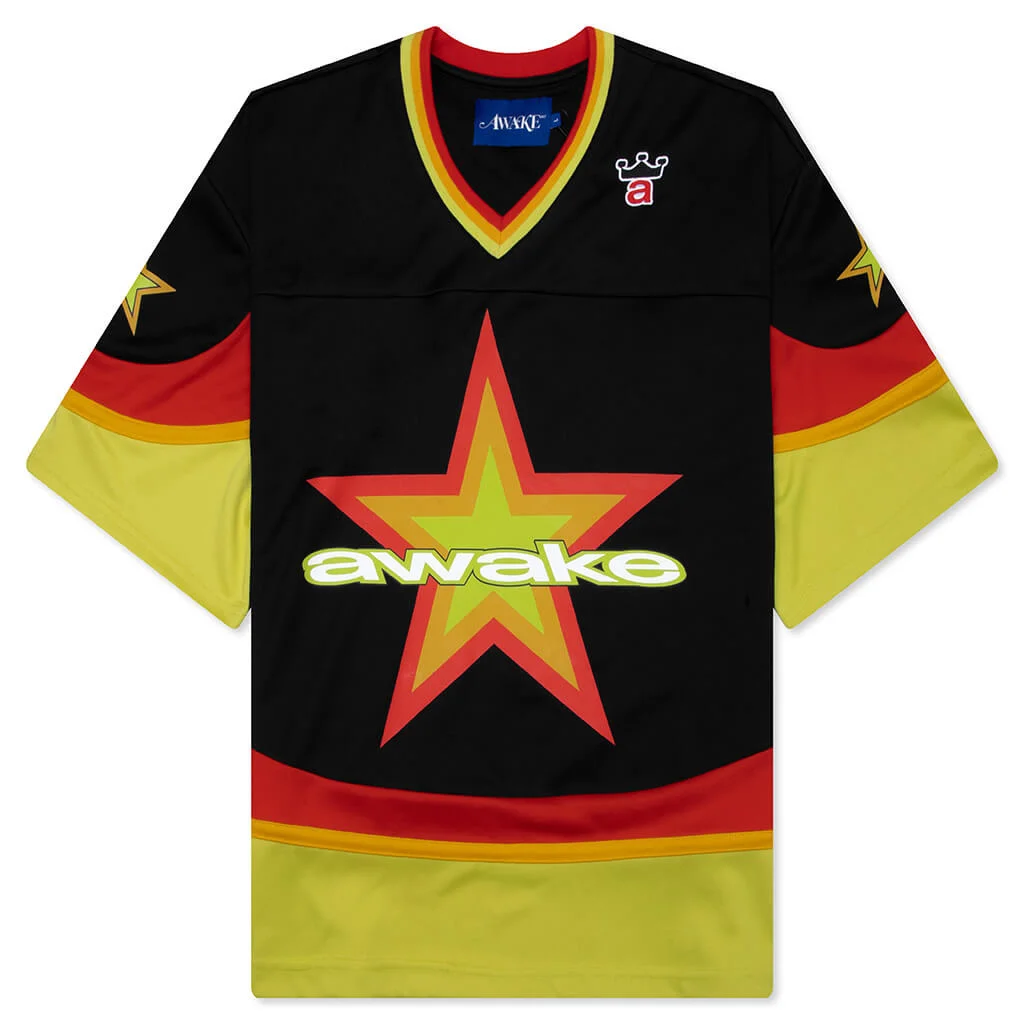 Made from 100% polyester, the Awake NY Sport Jersey provides comfort and breathability. Cut to have a boxy fit, this jersey is designed with color-block panelling, a v-neckline, and ribbed trims that stay true to classic sportswear aesthetics. Finished with screen-printed graphics and an embroidered logo patch. AWK FW25 TP003 BLAC - 100% Polyester - Boxy fit - Color-block panelling - V-neckline - Ribbed trims - Screen-printed graphics - Embroidered logo patch - Style No: AWK-FW25-TP003-BLK