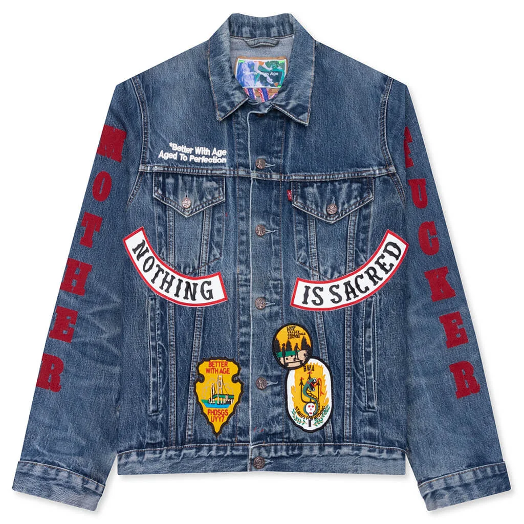 The Better With Age Clark Denim Jacket is a standout piece that embodies the brand's dedication to sustainability and individuality. Each piece is crafted from authentic vintage denim, giving each piece a one-of-one feel. Featuring a classic collar, adjustable waist tabs, and embroidered brand tagline, this jacket balances timeless structure with thoughtful design. Reconstructed with custom buttons and functional pockets, it offers both style and utility. This garment design varies and may display stains, blemishes, wear, or general signs of age, adding to its unique charm. BUYER WILL RECEIVE A ONE-OF-ONE VINTAGE JACKET IN A RANDOMLY SELECTED COLOR. PRODUCT IMAGES SHOWN ARE EXAMPLES AND MAY NOT REFLECT THE EXACT ITEM RECEIVED. ALL SALES ARE FINAL. - Fabric type varies - One-of-one design - Classic collar - Adjustable waist tabs - Chest pockets - Embroidered brand tagline - Custom hardware - Hand stitching, beadwork, pin ornament, patchwork, embroidery, dyed, or printed graphics - May show signs of wear, blemishes, or age - Style No: BWADJCLRK