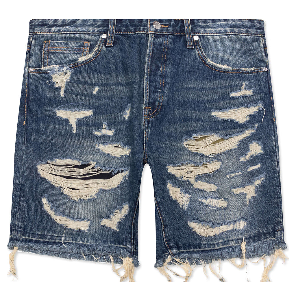 The BB Chronos Jean Shorts feature a classic five-pocket design with distressed detailing throughout, offering a worn-in aesthetic with thoughtful edge. Helmet embroidery at the back pockets adds a subtle branded element, while a frayed hem and custom jacron label complete the design with a nod to timeless denim construction. - 5-pocket design - Distressed detailing - Zip fly with button closure - Helmet embroidery on back pockets - Custom jacron label - Custom hardware - Frayed hem - Style No: 851-3102-700