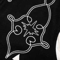 The BB Gold Peak Jacket brings a refined edge to classic varsity styling. Constructed with a wool-polyester blend body and leather sleeves, this jacket offers a premium mix of texture and durability. Embroidered designs on the front and back, along with wool patches on the sleeves, add standout detailing. Finished with ribbed trims, a button-up closure, and front pockets, this piece is both stylish and functional, perfect for cooler days. 841 8402 BLAC - 60% Wool, 40% Polyester; Sleeves: Leather - Ribbed collar cuffs and hem - Bottom up closure - Embroidered designs on front and back - Embroidered wool patches on sleeves - Front pockets - Style No: 841-8402-11