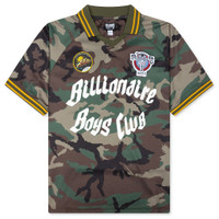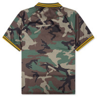 The FC S/S Polo is crafted from polyester, featuring an all-over camo print that adds depth and texture to the design. Screen-printed graphics at the front is complemented by an embroidered patch, creating a layered, refined look. Designed with a ribbed turn-down collar, loose fit, and striped cuffs and collar, this piece blends sporty elements with thoughtful detailing. - 100% Polyester - All-over camo print - Screen-printed graphics - Embroidered patch - Ribbed turn-down collar - Stripe cuffs and collar - Style No: 861-1320-319