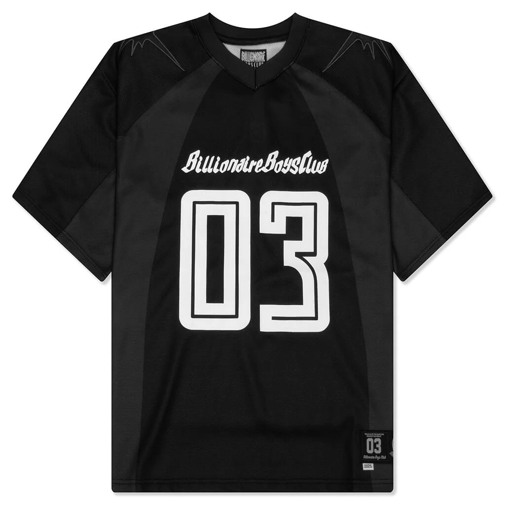 Billionaire Boys Club draws inspiration from athletic wear with the O-Line S/S Knit. Made from polyester with a cropped fit, this jersey features a paneled construction and ribbed V-neck. Patches and 3D rubber printed graphics add texture and visual details. A woven label sits above the hem for a sporty touch. - 100% Polyester - Cropped fit - Ribbed V-neck - Paneled construction - 3D rubber printed graphics - Patch graphics - Woven label at hem - Style No: 851-8305-001