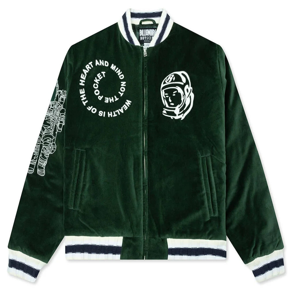 Layer up with the Billionaire Boys Club Wealth Jacket. Constructed with a soft cotton velour shell, this jacket is lined with quilted polyester and lightly filled for warmth. The two front welt pockets add functionality, while the ribbed knit striped trims round out the design. Decorated with embroidered and intricately stitched graphics for standout details. - Shell: 100% Cotton - Lining: 100% Polyester - Filling: 100% Polyester - Velour exterior - Quilted lining - Zip closure - Embroidered and stitched graphics - Front welt pockets - Ribbed knit striped trims - Style No: 851-8401-301