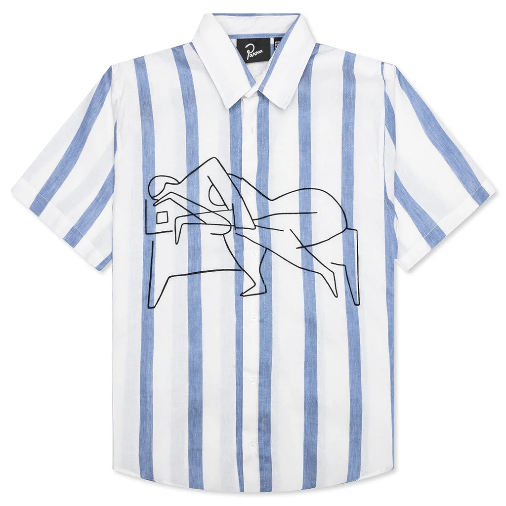 The Sleep Now Short Sleeve Shirt from By Parra delivers effortless summer styling with a refined twist. Crafted from a breathable linen-cotton blend, the shirt features bold embroidered artwork across the front, bringing the brand’s signature surrealism to life. This look is finished with a hidden Parra flag on the placket and is pre-washed to prevent shrinkage. 53240 BLUE - 52% Linen/48% Cotton - Made in Portugal - Classic collar - Button up - Striped pattern - Embroidered graphics - Eco pre-washed - Style No: 53240