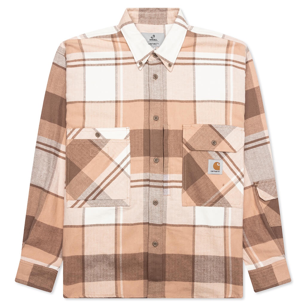 The Carhartt WIP x INVINCIBLE L/S Work Shirt Max combines utilitarian design with refined craftsmanship. Made from cotton herringbone flannel, this oversized shirt offers durability with a comfortable fit. Thoughtful details like a mesh-lined back and multiple pockets, including hidden zippered chest compartments, enhance functionality. A button-up closure keeps the silhouette clean, while co-branded embroidery and a Square Label add a distinctive touch. - 100% Cotton (herringbone flannel) - Oversized fit - Mesh lining at back - Multiple pockets - Hidden pockets with zipped chest - Button up closure - Co-branded embroidery and Square Label - Style No: A242060-2Z3