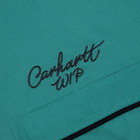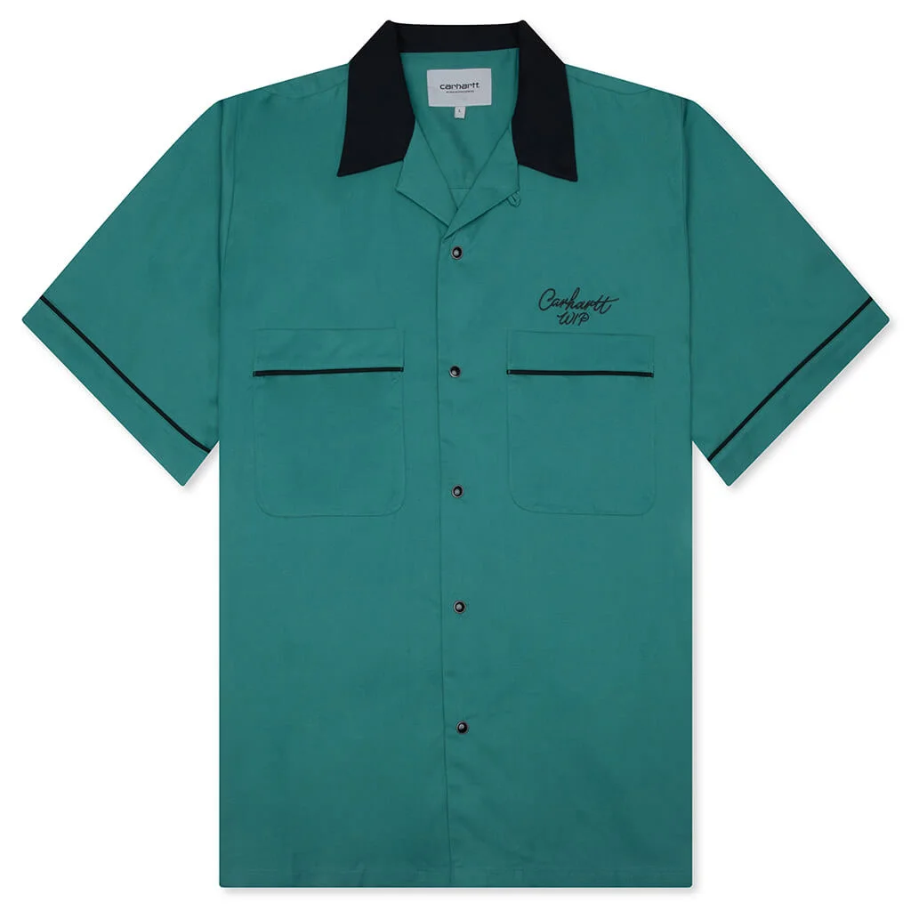 Step in style with the Carhartt WIP S/S Bowl Shirt. Made from a tencel-cotton blend, this shirt is cut in a relaxed, retro-inspired silhouette with a snap button closure, camp collar, and chest pockets. Contrast piping details outline the design for added structure. Embroidered branding completes the look. I035153 SAGU - 60% Tencel, 40% Cotton - Relaxed fit - Camp collar - Snap button closure - Dual chest pockets - Embroidered branding - Contrast piping - Style No: I035153-31VXX