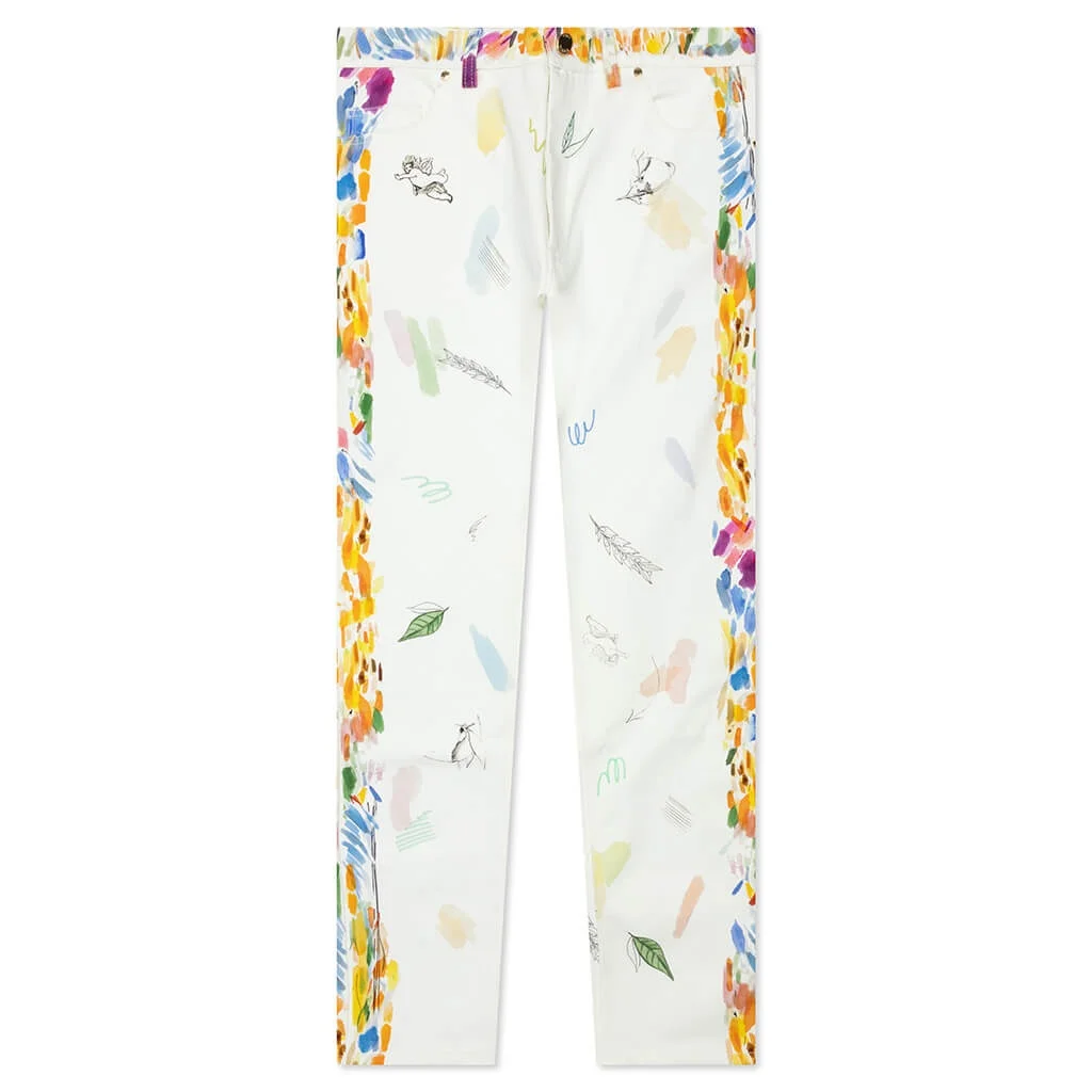 The Casablanca Printed Straight Leg Jeans elevate any wardrobe. Cut from organic cotton, the trousers feature straight legs and an all-over colorful printed imagery. The zip fly features a gold-tone button and engraved logo. The classic five-pocket design finishes the aesthetic. - 100% organic cotton - Straight leg fit - Zip fly - Five-pocket design - Screen-printed imagery - Engraved branding - Style No: MF22-TR-002-01
